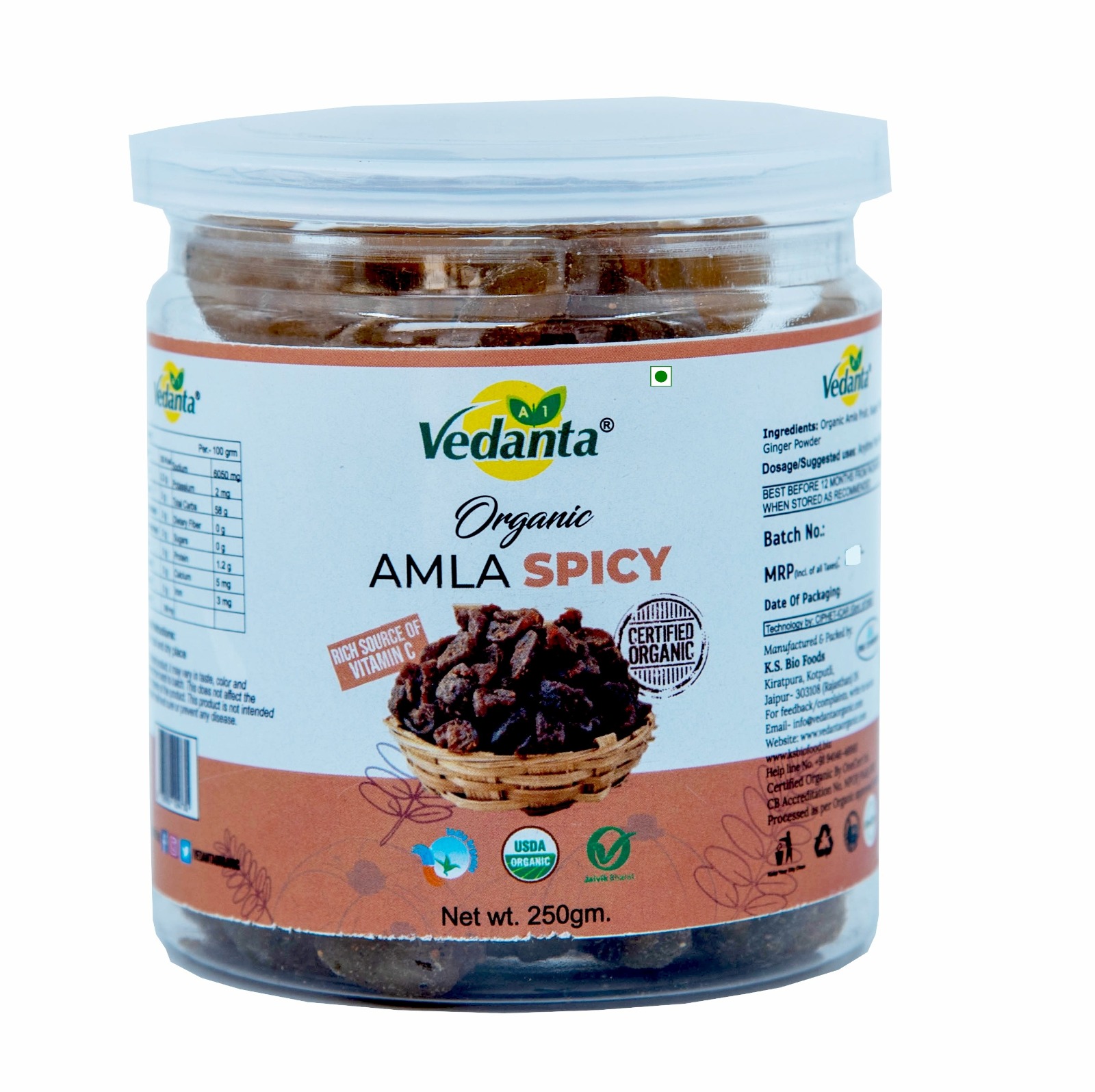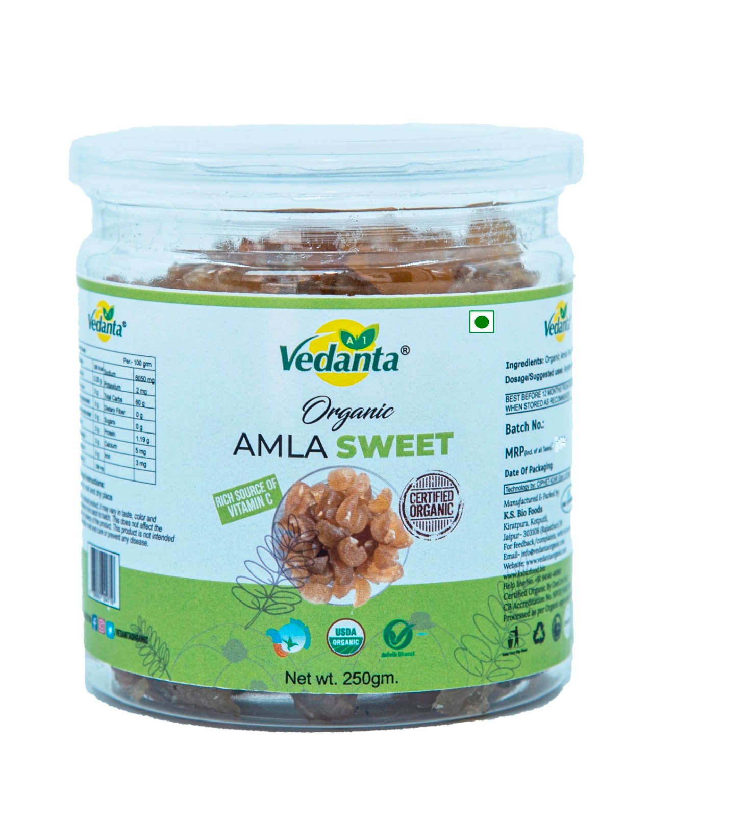 Vedanta Organics Amla Candy Sweet is a tasty way to enjoy the daily goodness of Indian gooseberry. Made from handpicked organic amla grown at our own farmhouse and slowly processed to lock in nutrition, each bite offers a natural boost of vitamin C and antioxidants that help support immunity, skin health and overall wellness. The balanced sweet-and-tangy flavour makes it a perfect after-meal mouth freshener, travel snack, or healthy alternative to regular candies for both kids and adults.